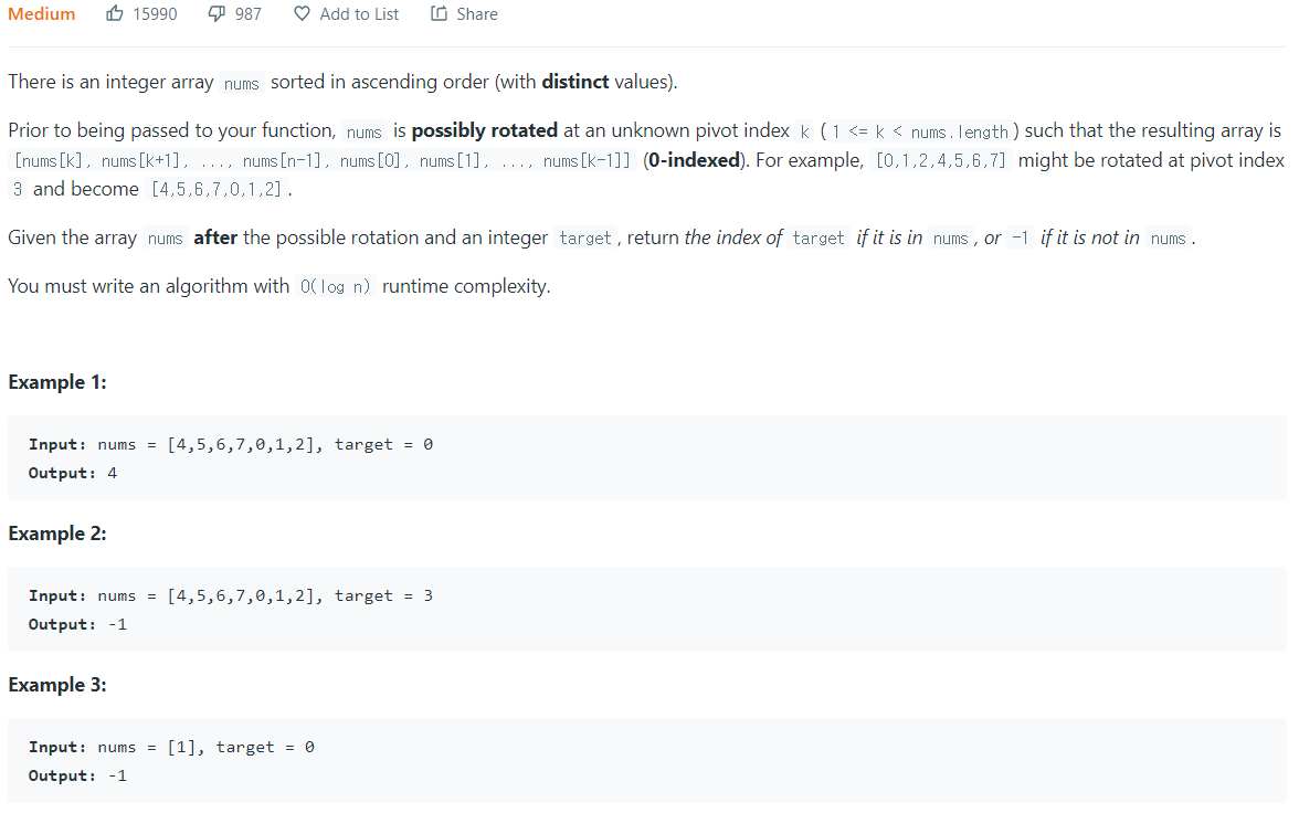 중복이 없는 정렬된 배열이 있다. 이 중 하나의 값을 피벗으로 배열을 회전시킨다. 그리고 회전된 배열에서 target 값의 인덱스를 반환하는 문제이다. (단, 시간복잡도는 O(logN))