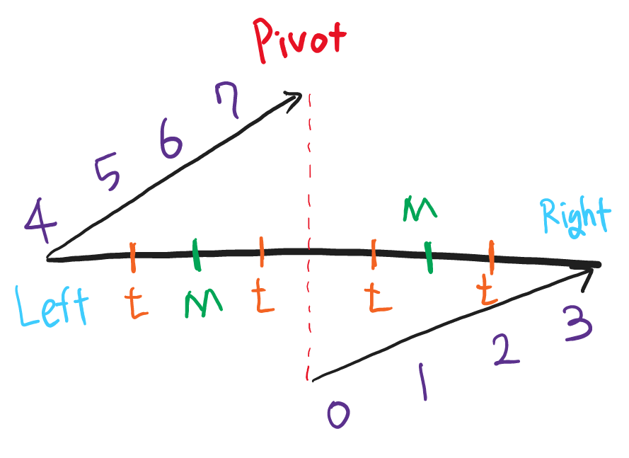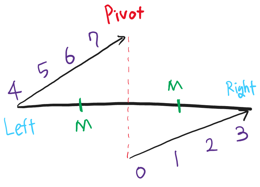 피벗을 기준으로 배열이 두 부분으로 정령되어있다. 이진 탐색은 target과 중간값(Mid)의 차이에 따라 Left와 Right를 움직인다. 정렬된 부분이 두 개이므로 Mid의 위치도 두 가지다.