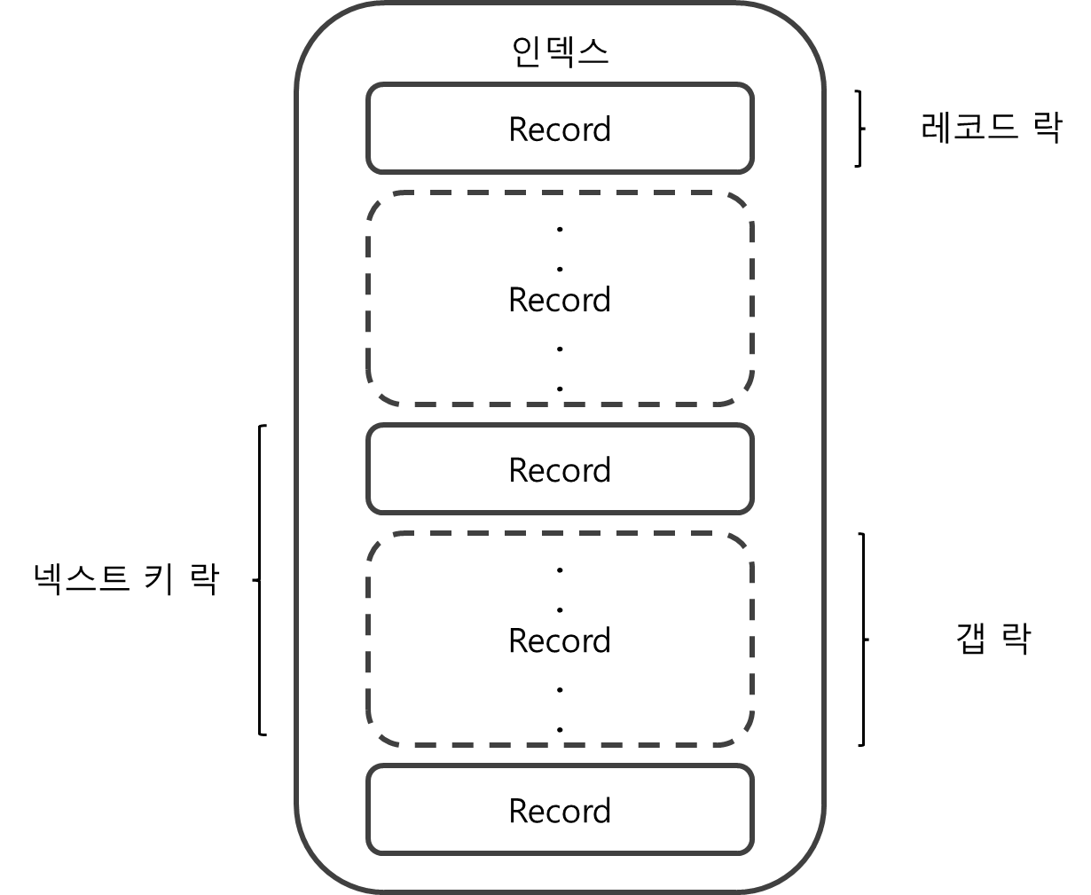 레코드 자체만을 잠그는 것을 의미한다. InnoDB 스토리지 엔진에서는 인덱스의 레코드를 잠근다. 인덱스가 하나도 없다면 자동 생성된 클러스터드 인덱스를 사용한다.